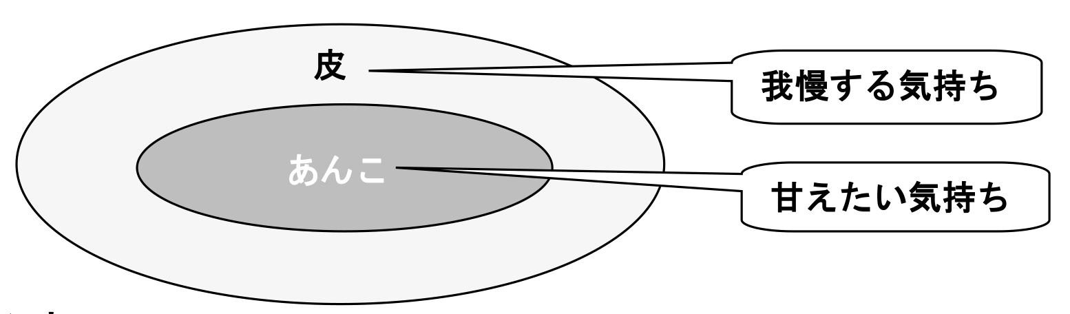 光元※は心の二つの面をまんじゅうの「あんこ」と「皮」という例で説明しています。 「人に甘えたり、怖がったり、寂しがったりするなど、人が抱える、柔らかく、傷つきやすい部分」が「あんこ」に相当する。そうした「あんこ」をまき散らさずに、工夫や対処をして「なんとか人に甘えずに我慢しようという気持ち」が「皮」に相当する。「あんこ」が「依存」、「皮」が「自立・共存」に対応すると説明しています。 親は「あんこ」への共感、そして、努力、頑張っている「皮」への共感、両方が大切となります。